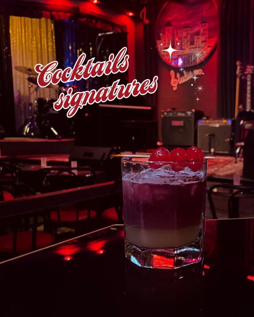 Au-delà de la musique, notre carte des cocktails est une véritable expérience en soi. Inspirés par les icônes du cabaret les plus légendaires, chaque boisson est soigneusement concoctée pour vous transporter vers une époque révolue d’élégance et de raffinement. Des classiques signatures aux créations audacieuses et inventives, il y a un cocktail qui n’attend que de devenir votre nouveau favori.